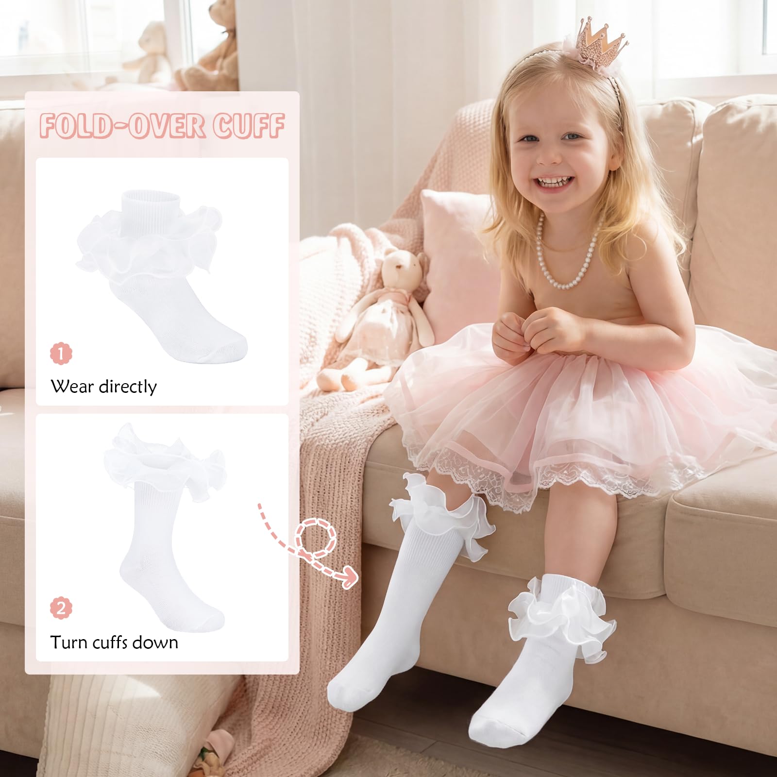 - Design: Oversized ruffle design, wrapped around the ankle, more suitable for cute princess girl heart; thicker high-quality fabrics to ensure that the child wearing comfortable, soft, skin-friendly, breathable, unlike other thin fabrics, high-quality cotton to use for a longer period of time; elite lined lace and raised sock tube design makes wearing more casual, not easy to fall off
