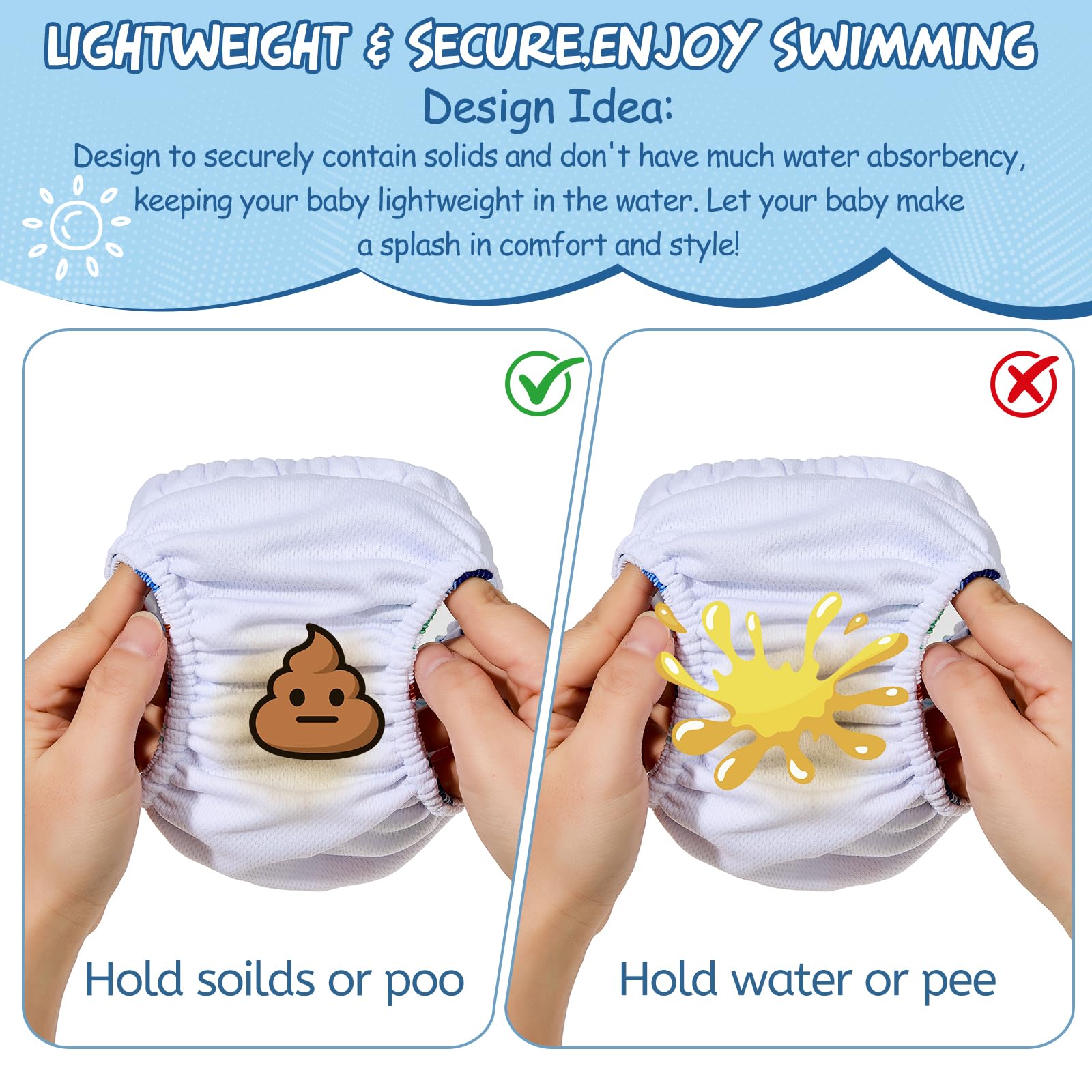 - LEAK-PROOF DESIGN - Keep pool days stress-free with reliable leak protection you can trust. This reusable swim diaper gently hugs the waist and legs with soft, stretchy openings that help contain solid messes without squeezing or leaving marks. The lightweight, multi-layer build stays comfy in the water, giving your little one the confidence to splash, kick, and play freely.