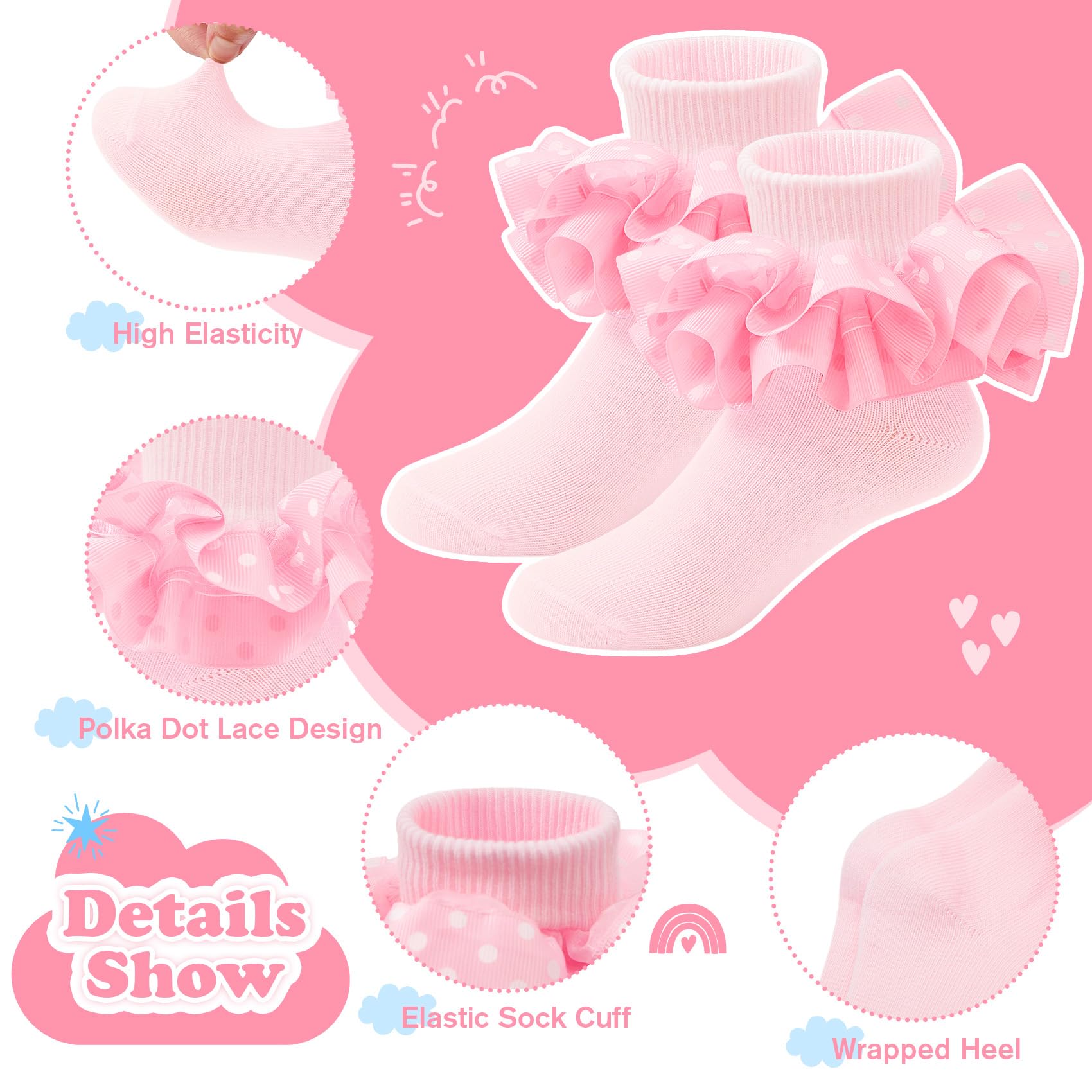 - Size and Color: Baby girl ruffle polka dot socks, suitable for girls aged 12 months to 10 years old, come in 6 colors for you to choose from, making them convenient to match with various life scenarios